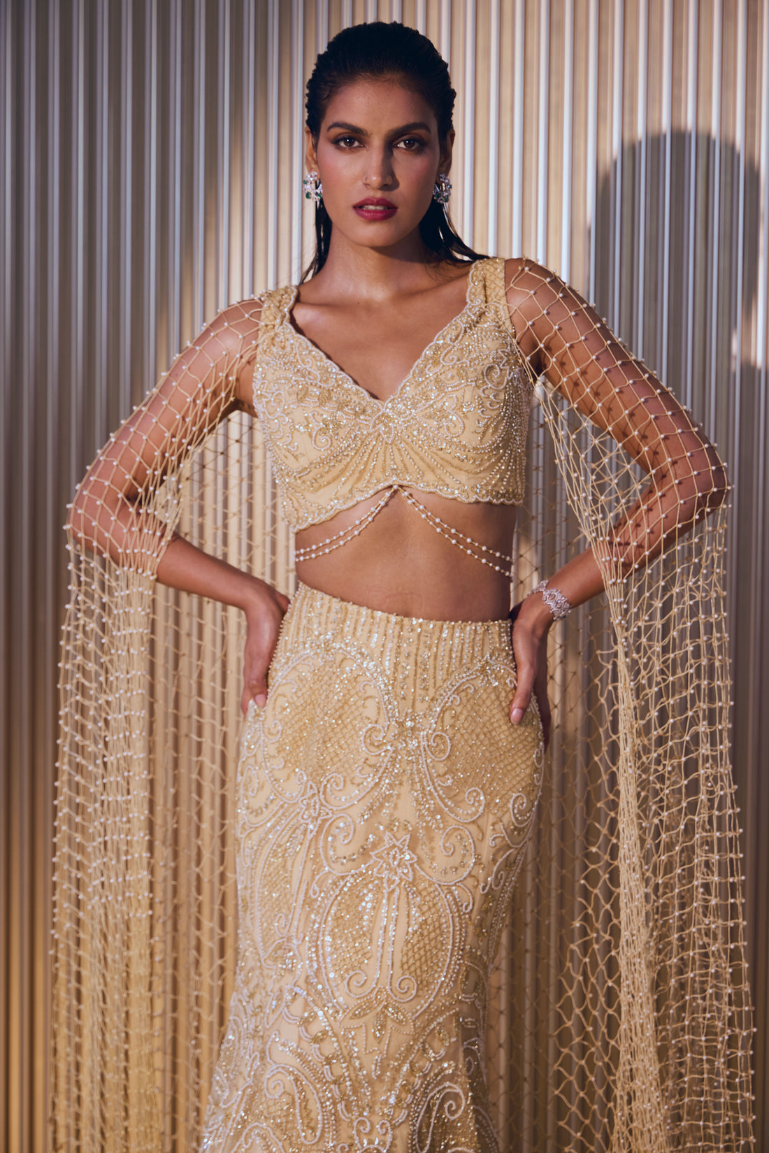 A gold lehenga with intricate lines of beadwork dispersed like sunrays paired with a beadwork...