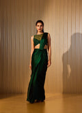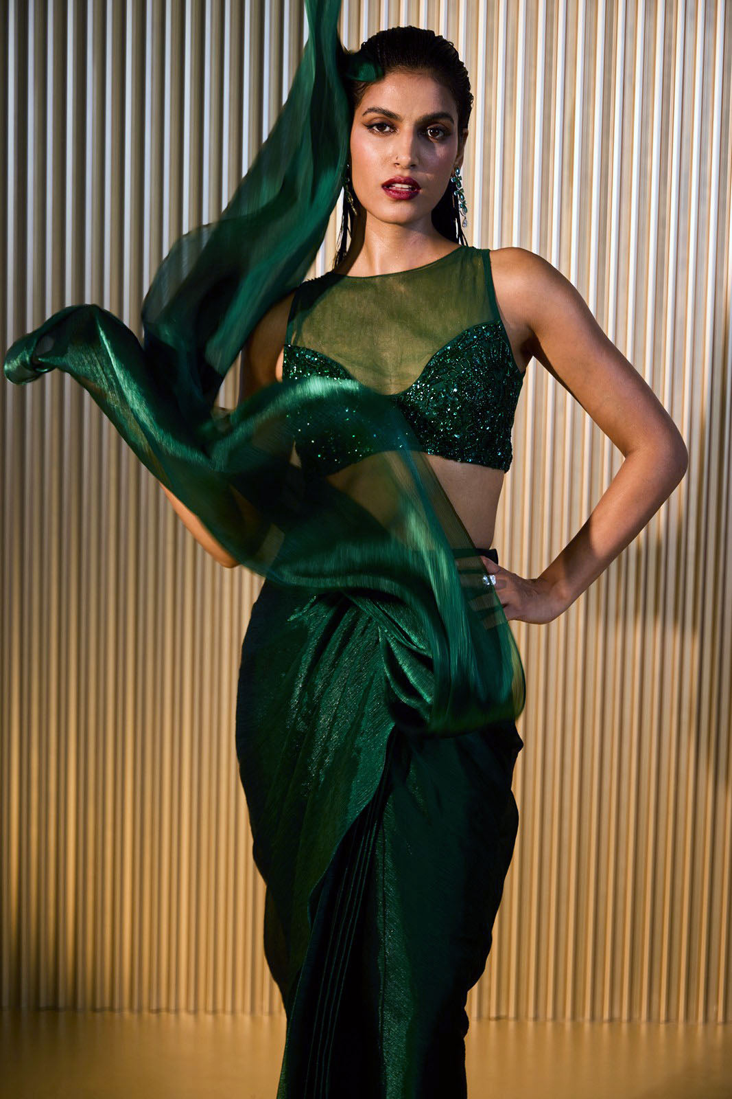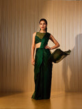 An emerald green elegantly draped concept saree paired with a hand beaded blouse