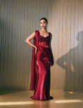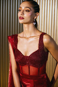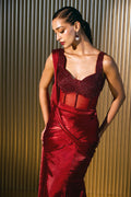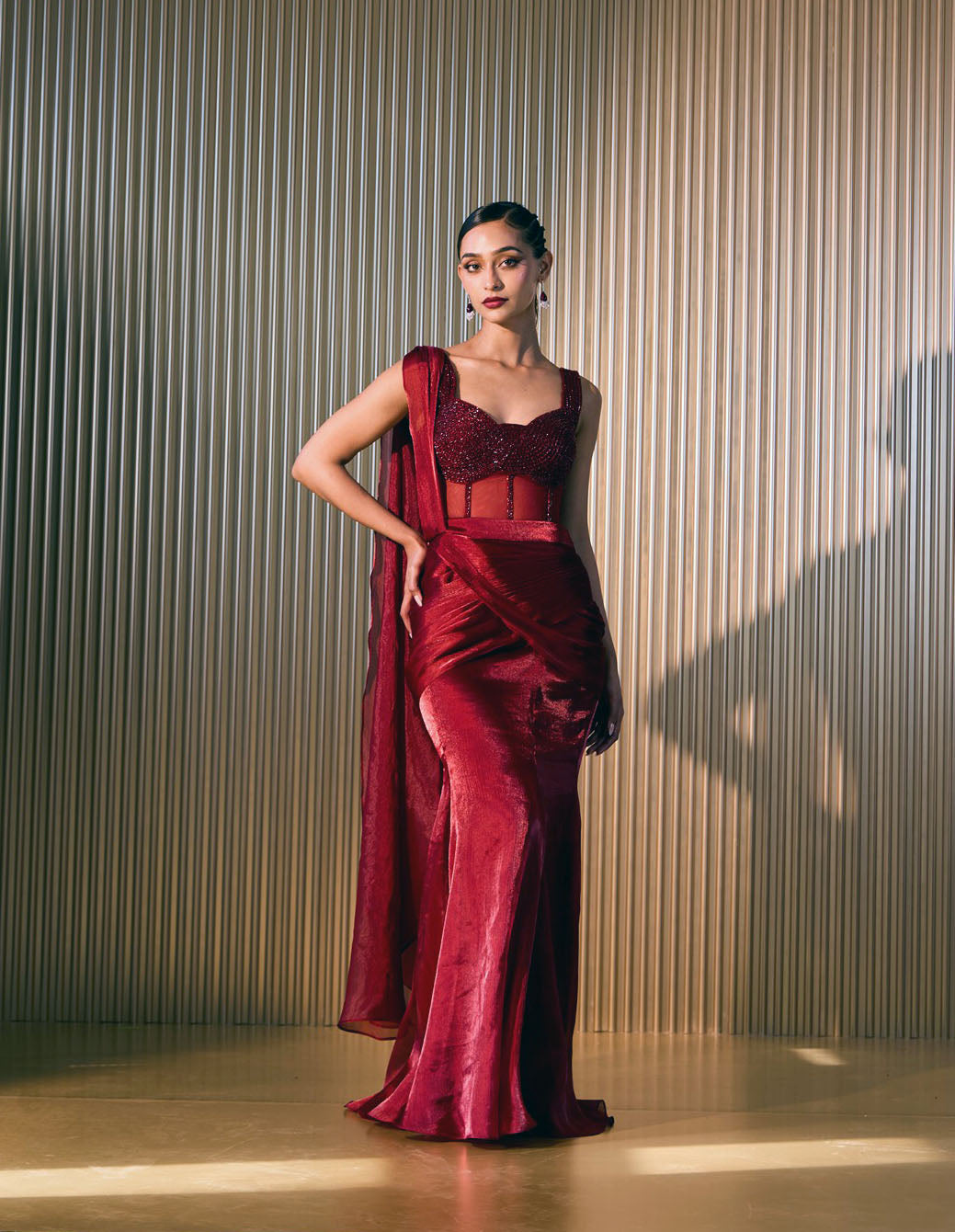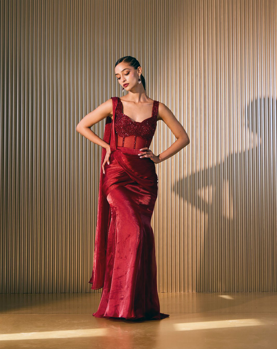 A deep red metallic fishtail concept saree paired with a sheer corset with shimmering wire embroidery